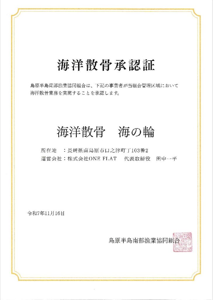 地元の漁業協同組合から認定を受けている正規の散骨業社です。 - 法律・条例を遵守した指定海域